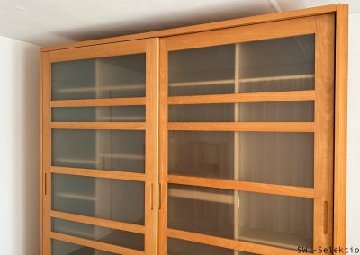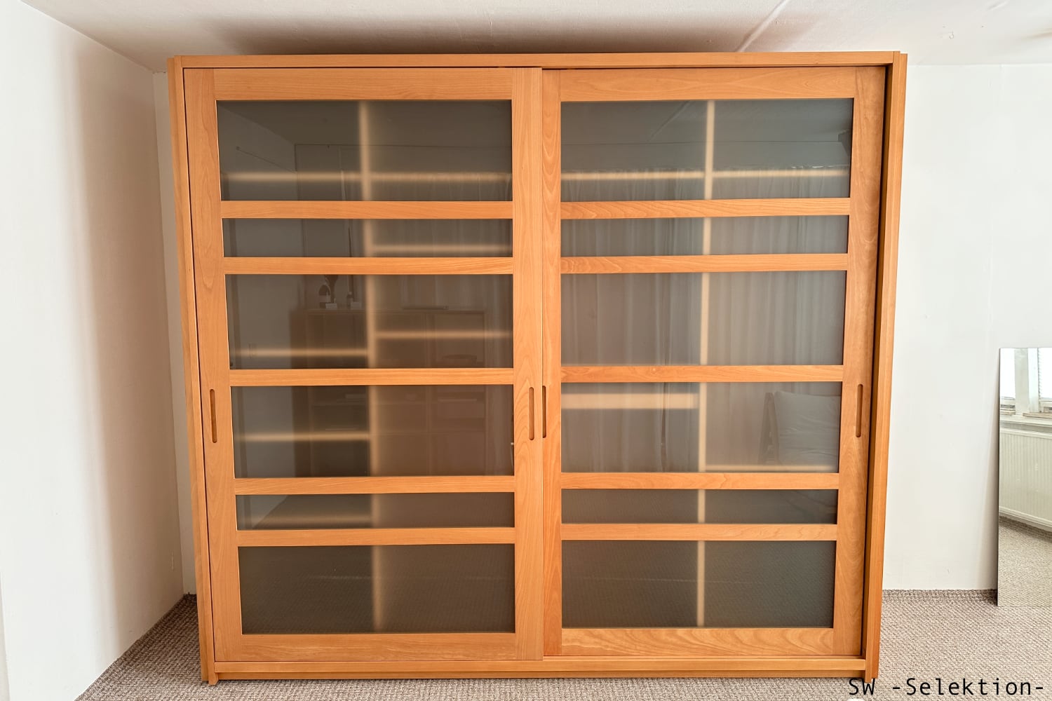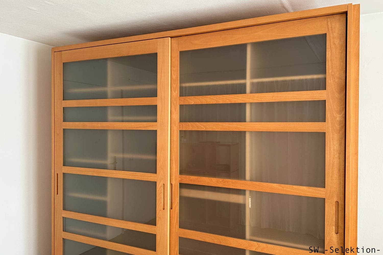 - 2 leichtgängige, platzsparende Schiebetüren mit Satinatoglas-Füllung: die dahinter liegenden Dinge sind nicht auf den ersten Blick sichtbar, sondern nur zu erahnen